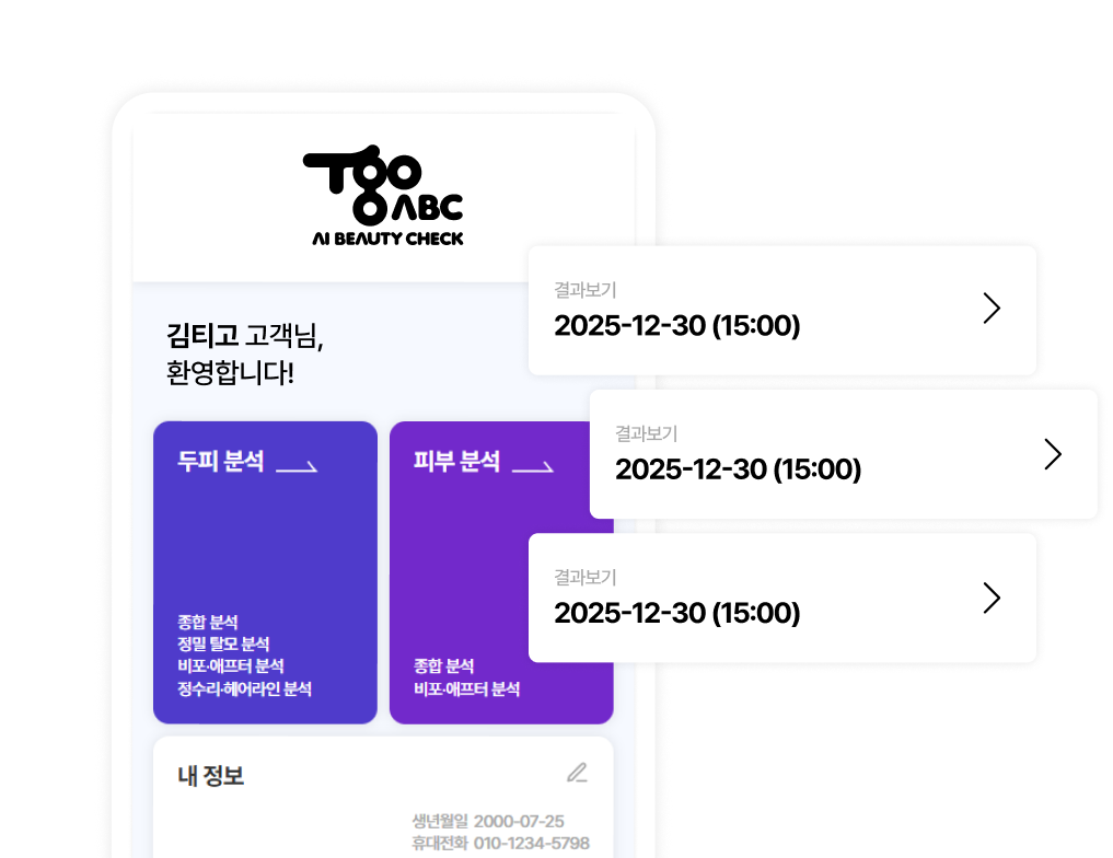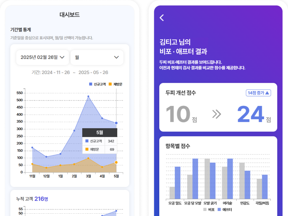 고객 전용 화면에서 별도 로그인 없이 모든 분석 결과를 확인할 수 있고 시술 이후에도 상태 변화를 지속적으로 추적해 체계적인 관리가 가능해요.